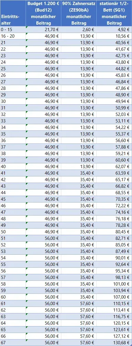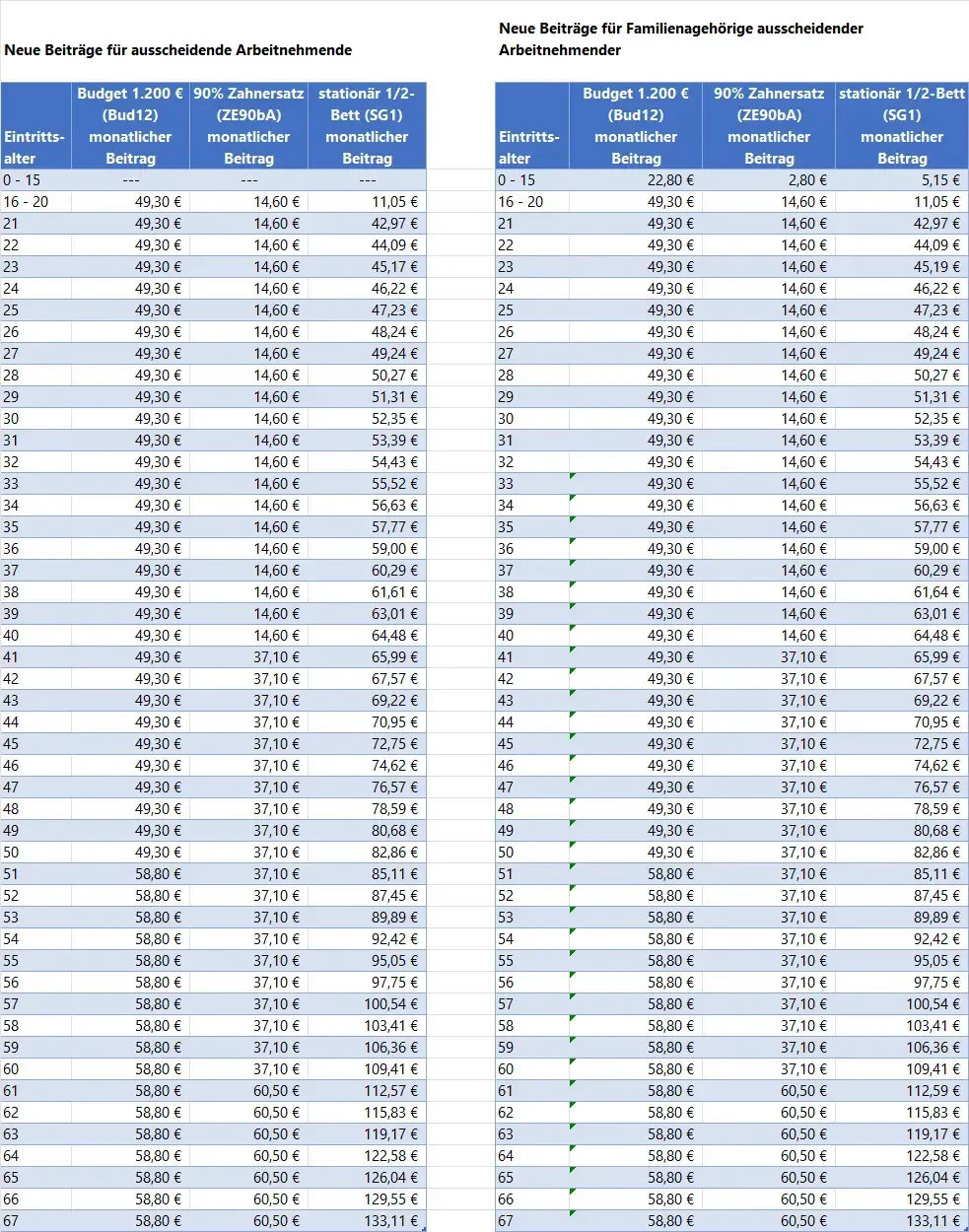 Das gilt sowohl für den eigenen Vertrag des/der Arbeitnehmenden sowie für ggf. bereits bestehende Verträge mitversicherter Familienangehörige. Der Beitrag wird pro Person zum Alter bei Austritt neu kalkuliert; Beitragsrabatte aus dem Gruppenvertrag des Arbeitgebers entfallen.